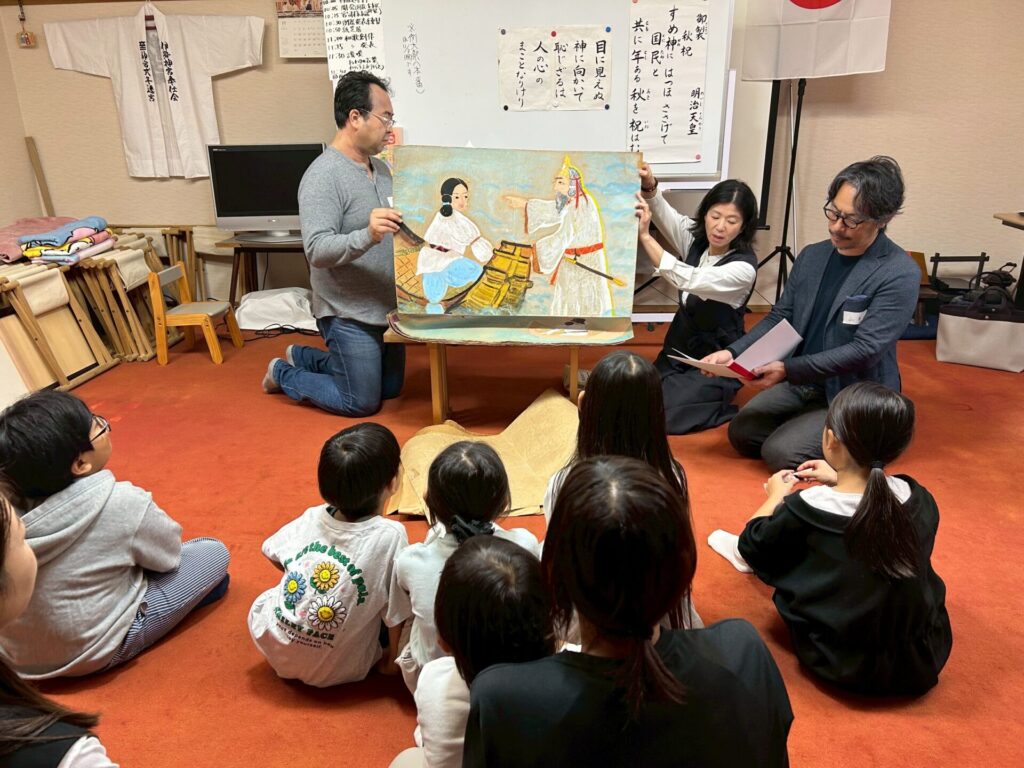 第3回目は「海幸山幸」の物語を、3人の語り部による臨場感あふれる朗読で楽しみました。子どもたちは神話の世界に引き込まれ、物語の持つ深さを感じていました。