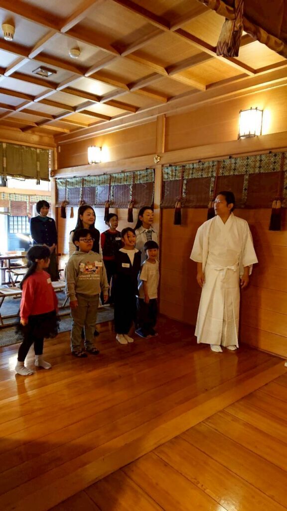 今回は、神社での正式な作法である「玉串の奉納の仕方」を伝授いただきました。細かな所作一つひとつに込められた意味を子どものうちに学ぶことは、将来必ず役立つ貴重な機会となりました。
